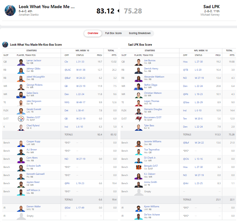 I mean, what a gross fantasy football game. Really gross. Lamar Jackson had his third straight game with less than 14 fantasy points. All of my wide receivers had less than 10 points and my flex choice of Gerald Everett resulted in zero points. Luckily for me, only one team did worse than me this week.