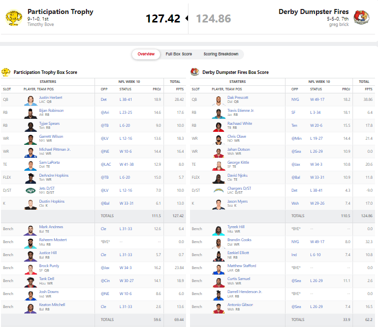 Bove lost his first matchup last week and bounced back this week with a very tight win over Greg, 127.42 – 124.86. Justin Herbert had a team-best 28.42 points, and Bijan Robinson scored 17.6 points which is the best output by the Atlanta running back since week four. Garrett Wilson and the New York Jets defense combined for 28.3 points on Sunday night , which ended up just being enough.