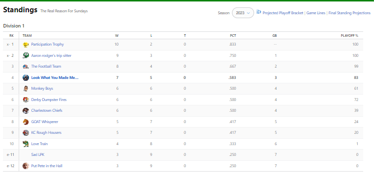 I am precariously in the fourth spot, but if I lose and fall into tiebreaker battles with the rest of the league, I am in trouble seeing how I have more then 100 points less than Brick who is currently in sixth place.