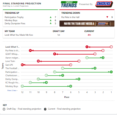 The first place team continues to roll along. The emergence of Michael Pittman Jr. has been a major surge to the Participation Trophyโs potential. And Tank Dell continues to be a bonker young talent for the Texans. He has had four straight weeks with 17+ points. Bijan Robinson came up huge with 27.3 points. Just his third 20+ point game of the season and his first since week two.