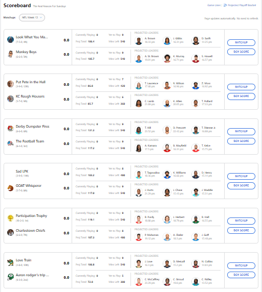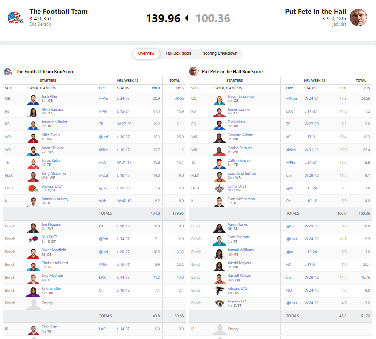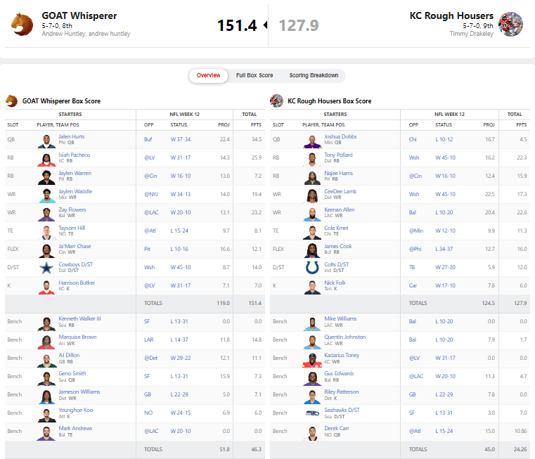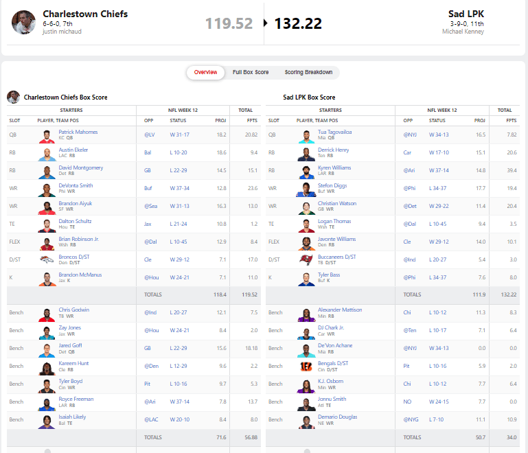 Greg Brick with the MASSIVE victory over Vaghi. This one may have sent the most dominoes falling for the next two weeks. Greg got 32.24 points from Dak on Thanksgiving. Vaghi did score 18.5 from Amon-Ra St. Brown on Thursdayโฆso that gap wasnโt that big. However, once Black Friday came and went, Greg knew he was in the driverโs seat. Tyreek Hill had 25.4 points against the New York Jets, and from there it was lead protection time.
