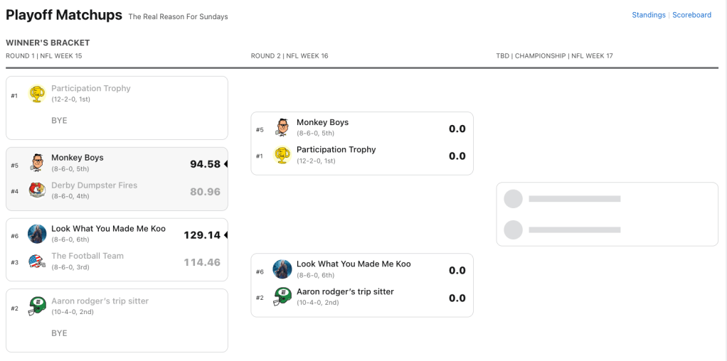 Eric, the statistically deepest and most talented team (at least according to the deep analytics), got bit in the ass in the quarterfinals. Josh Allen did his best despite throwing for less than 100 yards, but the decisions made in playing the players he did doomed Eric. Trey McBride was a great call, but seeing four 20+ scorers on his bench has to hurt.