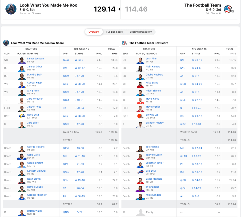 It is by no means a bad score for Eric. 114.46 is about eight points less than his average, and that is not detrimental. And Eric canโt beat himself up for not playing some of his high scoring bench players. Chandler had not scored double-digit points since Week 11, and had only done so twice this season. Tee Higgnis hadnโt scored double-digit points since Joe Burrow got hurt and his own injury where he missed three weeks. And Terry McClaurin was coming off of a goose egg against Minnesota in week 13.