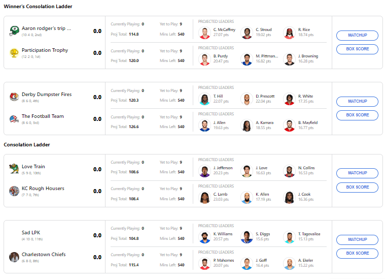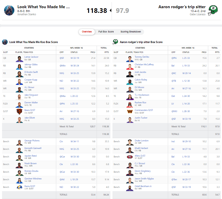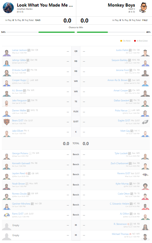 Things started off great for my team with Jamhyr Gibbs scoring 24.0 points on Saturday against the Minnesota Vikings. He ended up being my teamโs highest scorer for the week, but thankfully for my team there were no truly horrendous performers to sink my battleship. Lamar Jackson performed well on Monday night after a slow start, and the trio of Eagles (DโAndre Swift, A.J. Brown and Jake Elliot) all performed adequately against the New York Giants. I did not have to eat crow seeing George Pickens on my bench with 35.5 points, and Romeo Dobbs with 17.9. Canโt afford the misjudgement of roster management in the championship match, so have to tighten that up.