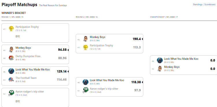Ah, the championship that everyone predicted at the start of this. The championship with the fifth and sixth seeds. I donโt think that fantasy football has any correlation to real football in terms of some rust after a bye week. These semi-finals are simply a case of a team getting all the right players at the right moment and the other team getting pounded into the pavement by the arm of a 100 year old quarterback.
