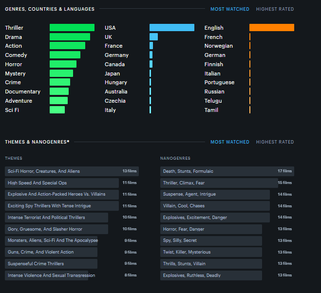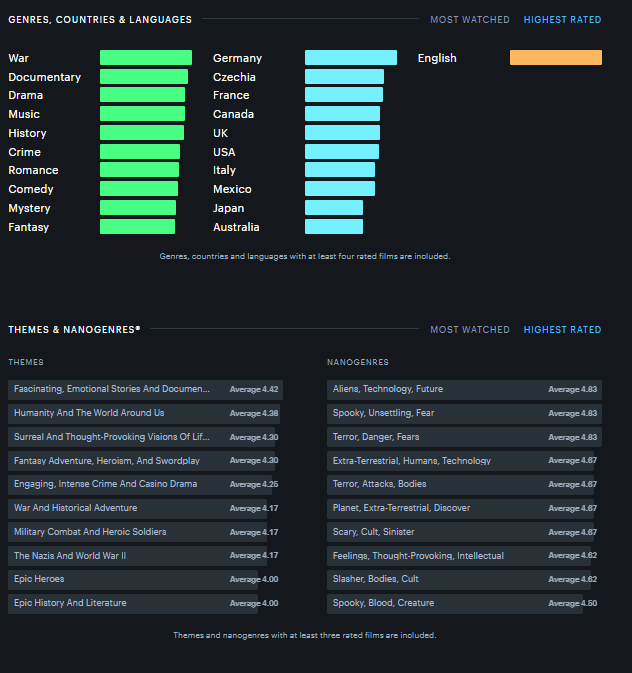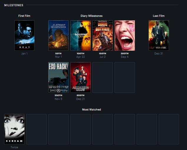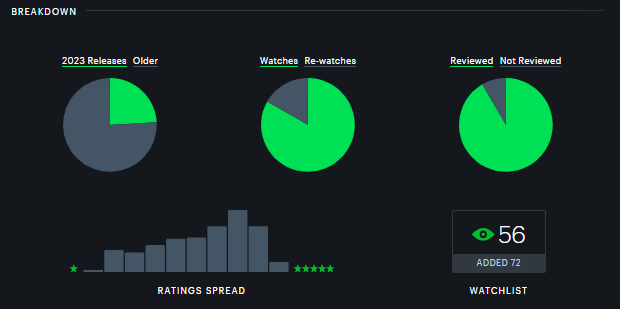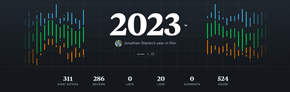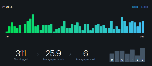 311 movies in year, that isn’t too shabby. I am very excited for when Letterboxd Wrapped comes out in January, whenever that is, but for now this will have to do. There was only one week this whole entire year where I did not watch a movie. That one week was in preparation and during Super Bowl week when I was in Arizona for work. That makes a lot of sense.
