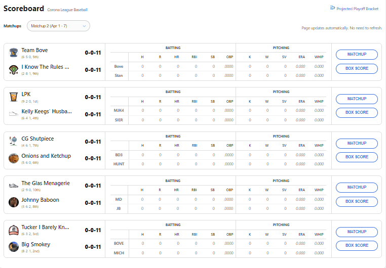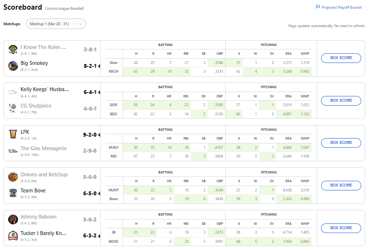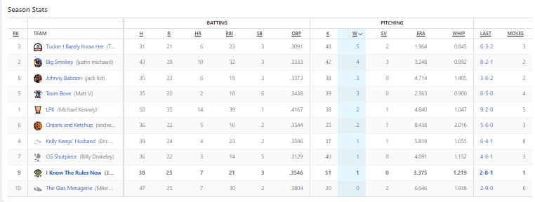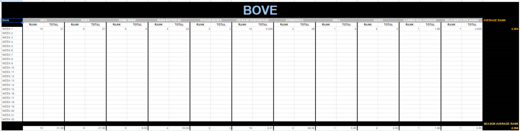 Much like Vaghi, who took Bove’s team name, Bove won his week one matchup primarily because of the pitching categories.