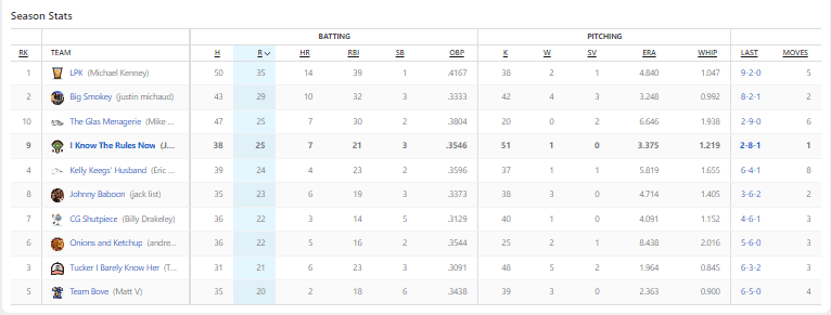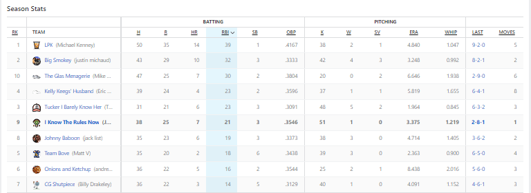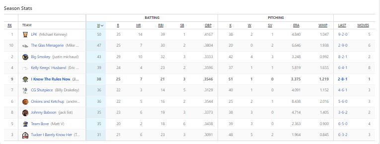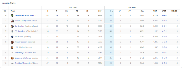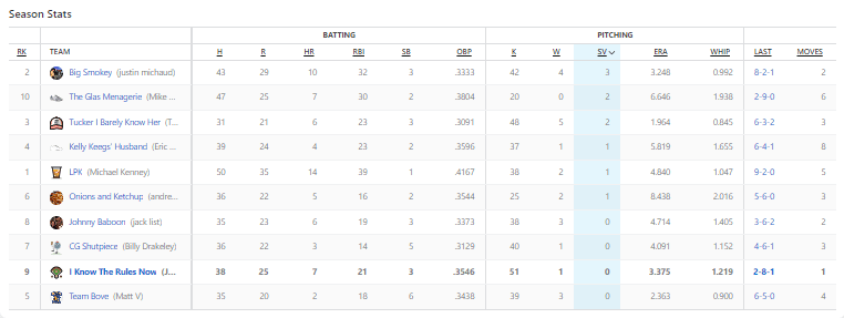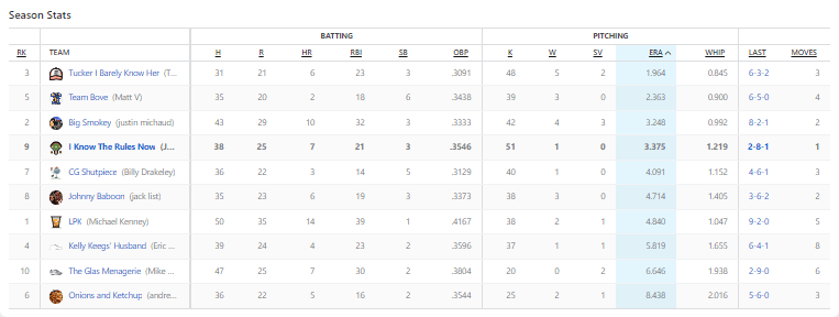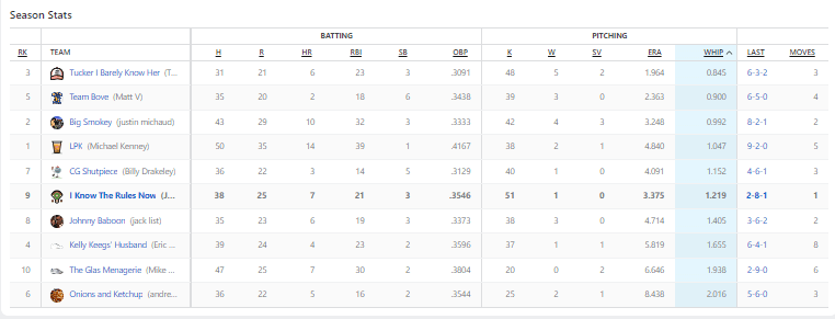 The only thing that I’ll say about my team is FUCK YOU Jose Leclerc! The reliever for the Texas Rangers allowed four earned runs on Sunday, and I would go one to lose the ERA category because of his flubbing. Brutal.
