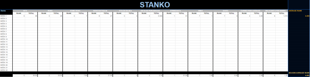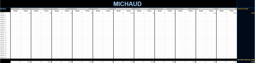 Michaud led only one category this week, but he was top four in all but one category. His lowest category was OBP which was eighth, but that didn’t diminish him too much. Michaud was still the only one with an ASR under three.