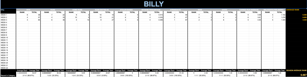 Huntley won five of the six hitting categories, which isn’t too much of a surprise seeing how Eric had the fewest hits of the week.