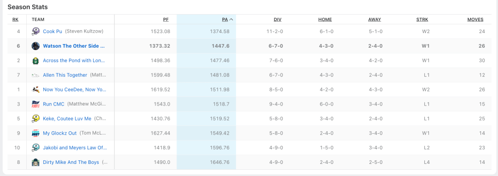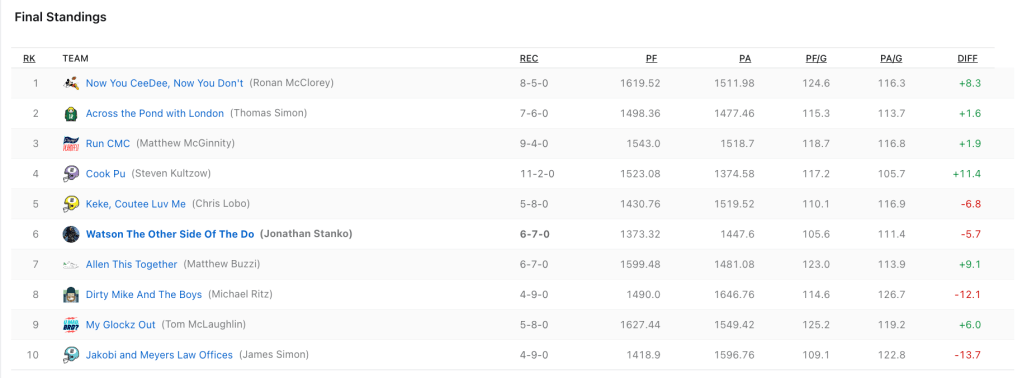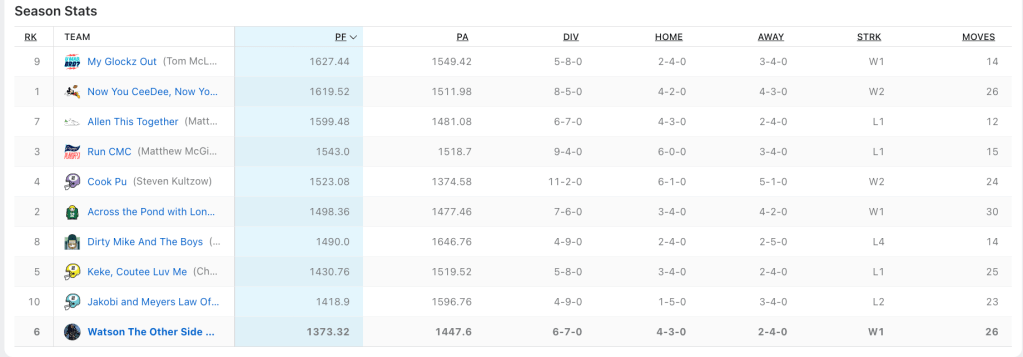 I suppose I didn’t have the best start, assuming the league’s members could be held accountable to the draft lottery rules. But hand up, I’ve got to be better. The commish is currently trying to learn how to balance many different things in his life, and fantasy football is now one of them. The Commish is also stressing about how last season he had the fewest points scored last season and the second most points against. Can’t be continuing with that bad luck.
